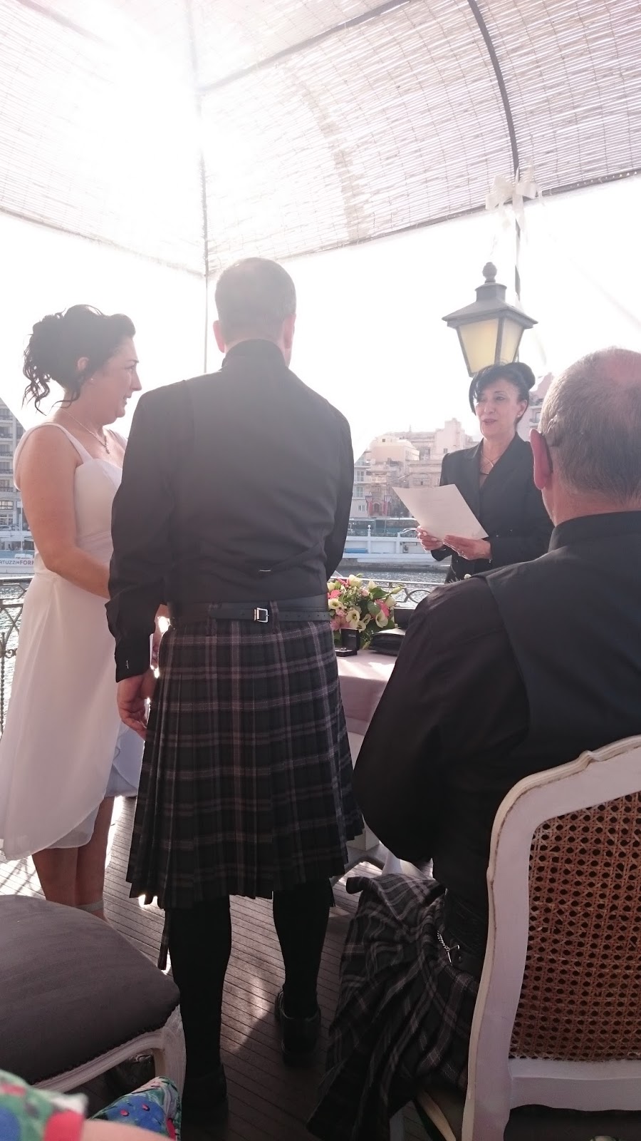 After the emotional ceremony, which included two romantic poems – traditional Maltese wedding style – we celebrated with prosecco and photos, before heading back out onto the balcony, where the ceremony are had been transferred into two dining tables. Dining at sunset provided a much-needed breeze in the 40 degree heat, giving a perfect atmosphere for the meal. The food itself consisted of lamb ragu for starter, sea bass for main and a chocolate pudding, incorporating both the Italian influence and seafood-legacy Malta has. After the dinner and speeches, there was the classic throwing of the bouquet, where locals and tourists joined in, and the woman who caught it (not part of the wedding party) was absolutely over the moon, having her night made. We proceeded to move to a bar, Tropicana, (two of the three men wearing kilts nipped back to the hotel to change at this point, as kilts and hot weather is not a comfortable mix!) where we had booked a table to end the nights with drinks and good laughs. It was a fantastic wedding, the bride and groom were happier than ever, and there wasn’t a single fault throughout the evening.