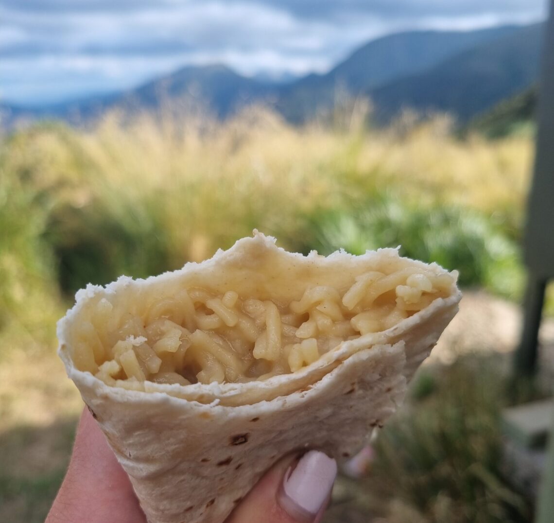 Let’s start with a firm thru-hiker favourite: the ramen bomb. I hadn’t heard of this before New Zealand, but it quickly became my favourite meal of choice. Simply add dried potato flakes to your ramen (while it is in the cooking water), to create a thicker sauce. It doesn’t add much in the way of nutrition, but it amps up the calories and adds a creamy element to the sauce. Want an even bigger calorie punch? Add it to a wrap, and create the ramen bomb wrap. *chefs kiss*